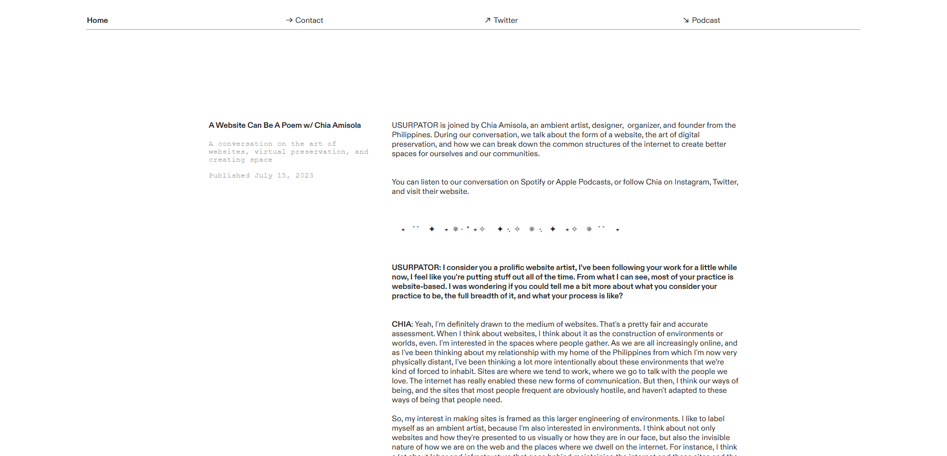 This experience reminded me of an interview I read about Chia Amisola's practice. As a website artist, she uses the web as a medium for her performances, often referring to her work as "ambient art" and the "poetic web." She describes her practice as the "construction of environments or worlds."