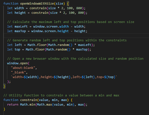 This was the code that I asked ChatGPT to help generate them. The function openWindowWithSize allows opening windows in random sizes. One thing I really have grown to appreciate in computational coding is having a random function.