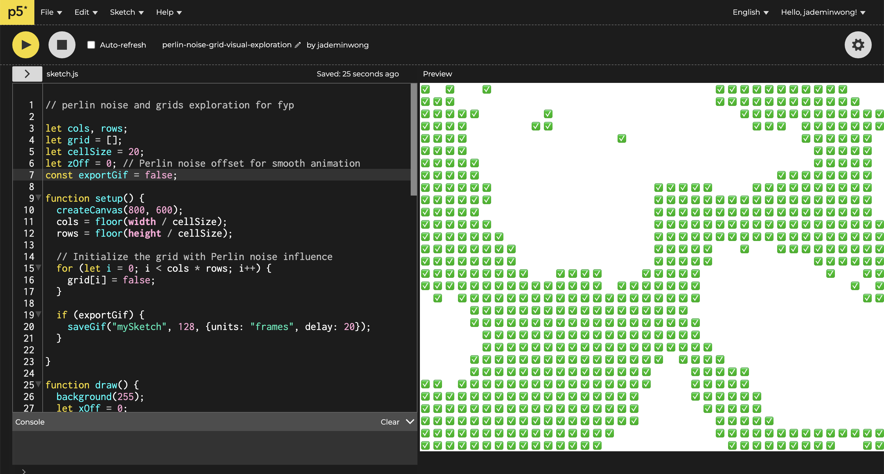 The previous time, creating gestures to browsers inspired me to attempt to create more visuals using web based visuals. This time, I wanted to try to incorporate a perlin noise algorithm, and filling it with checkboxes into each cell instead. I don't know how it links to whatever I'm doing, but I'm taking it as an exercise to see where it takes me.