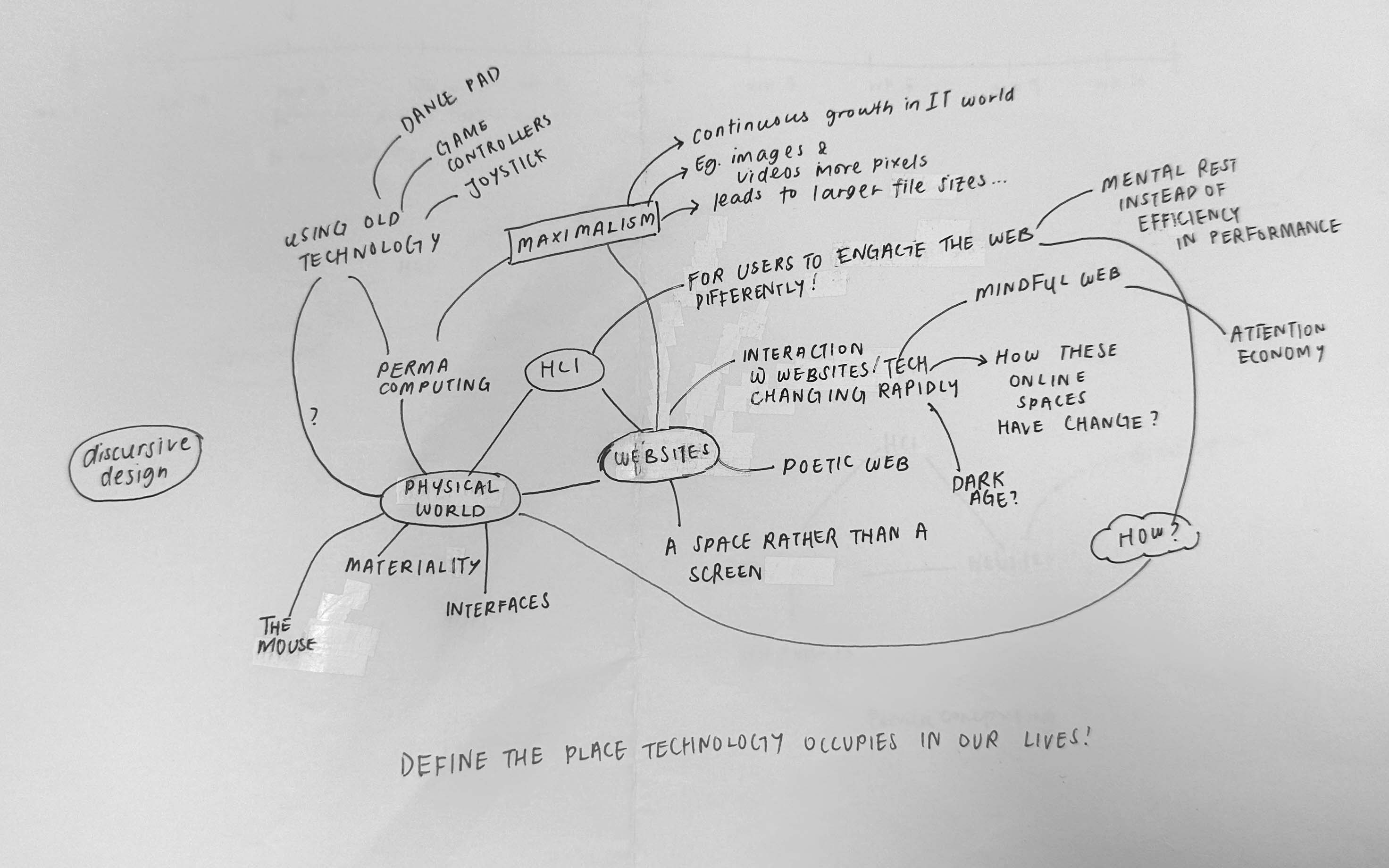 I think I would have to be more specific my research with the web. Currently, I have only conceptualised that websites have become homogenous compared to early web, then I also thought about how websites are designed to constantly grab our attention (attention economy), and how I think users should have more awareness and intention when browsing the web. I would read up more on the different ways people list problems of the web and then narrow down on my research subsequently.