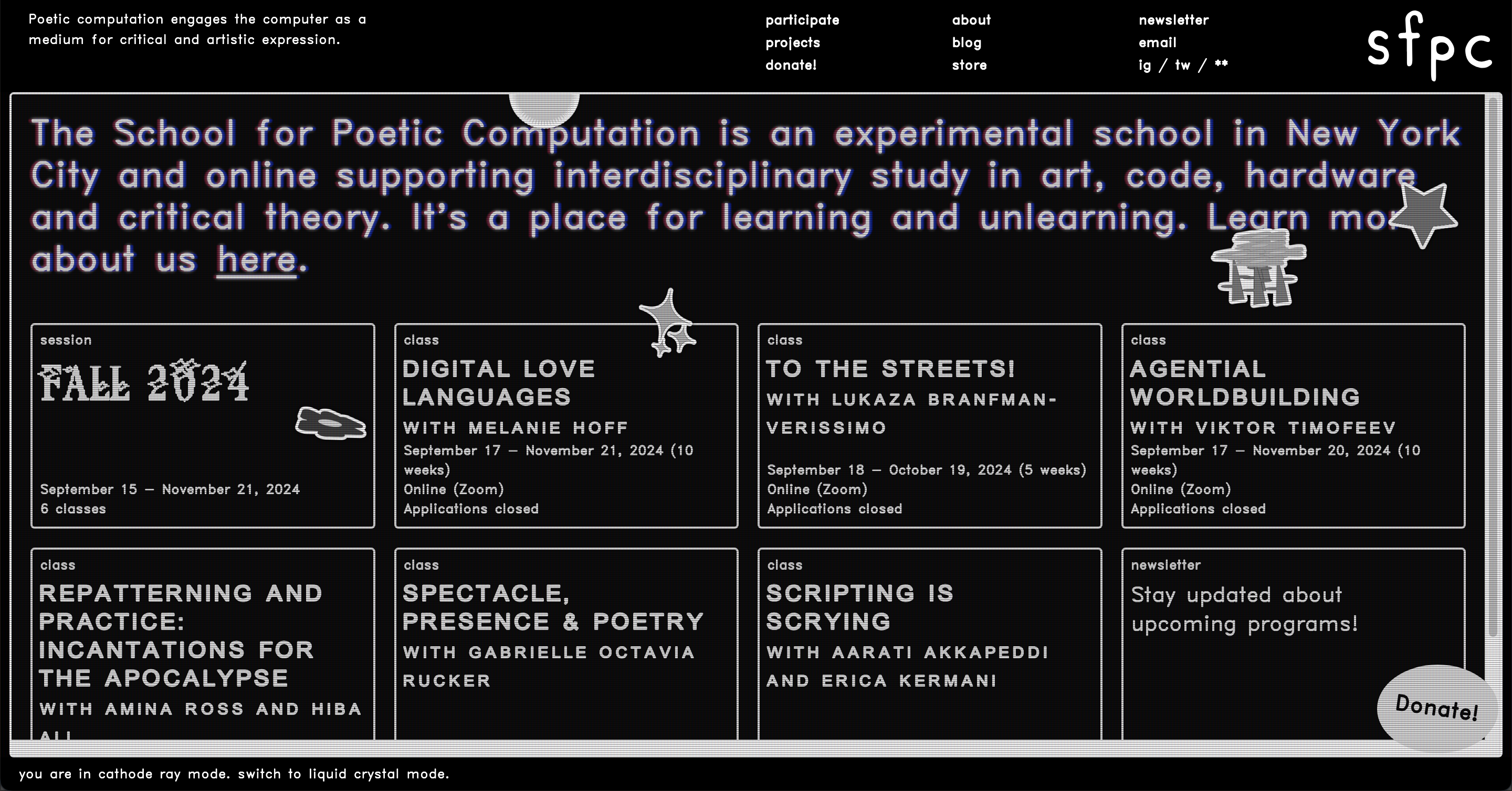 The School For Poetic Computation is an experimental school and the main term 'Poetic Computation' is constantly defined and redefined by them. Aside from the super cool website which allows for both dark and light mode, the school mainly engages the computer as a medium for critical and artistic expression. It also looks at technology as a tool to be used for critical thinking and aesthetic inquiry.