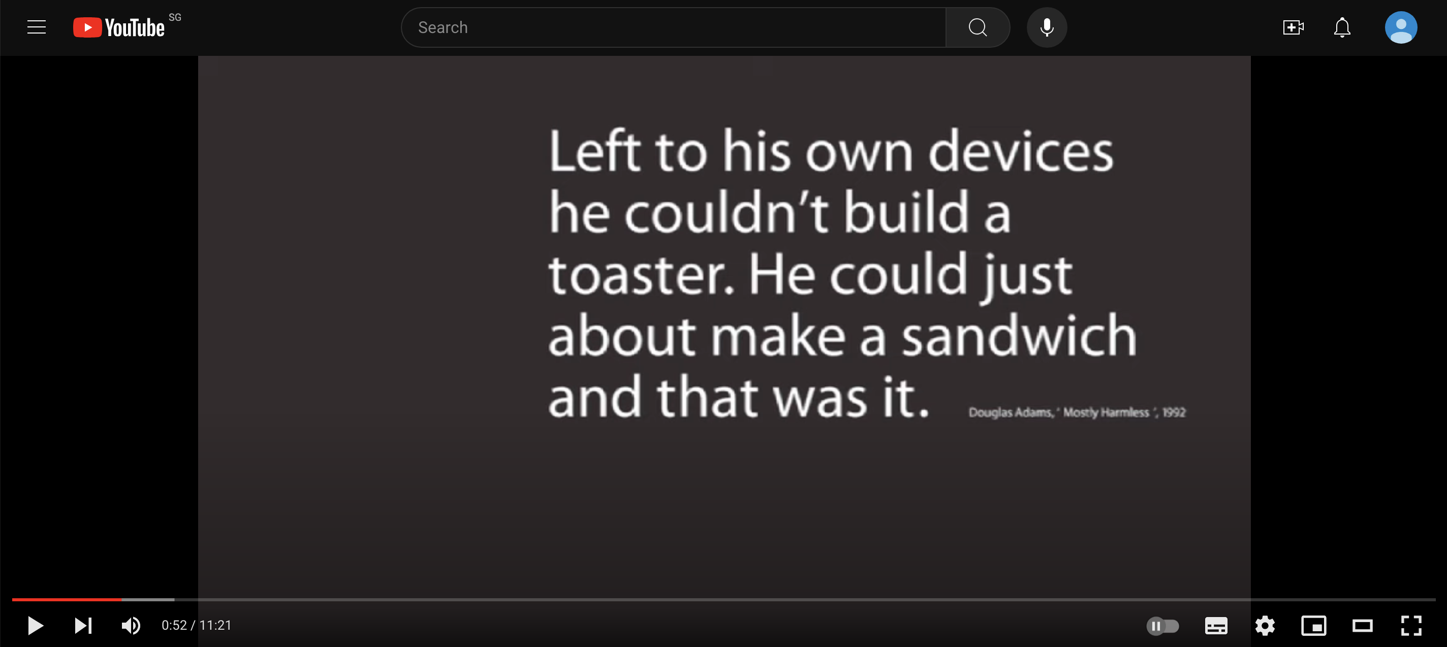 I didn’t read the book - but I watched the TED talk. This quote resonated with me: “The smaller the scale you want to work on, the further back in time you have to go.” (Timestamp: 4:30) This was in reference to the part where he needed to get iron, and couldn’t find a step-by-step tutorial on metallurgy.
