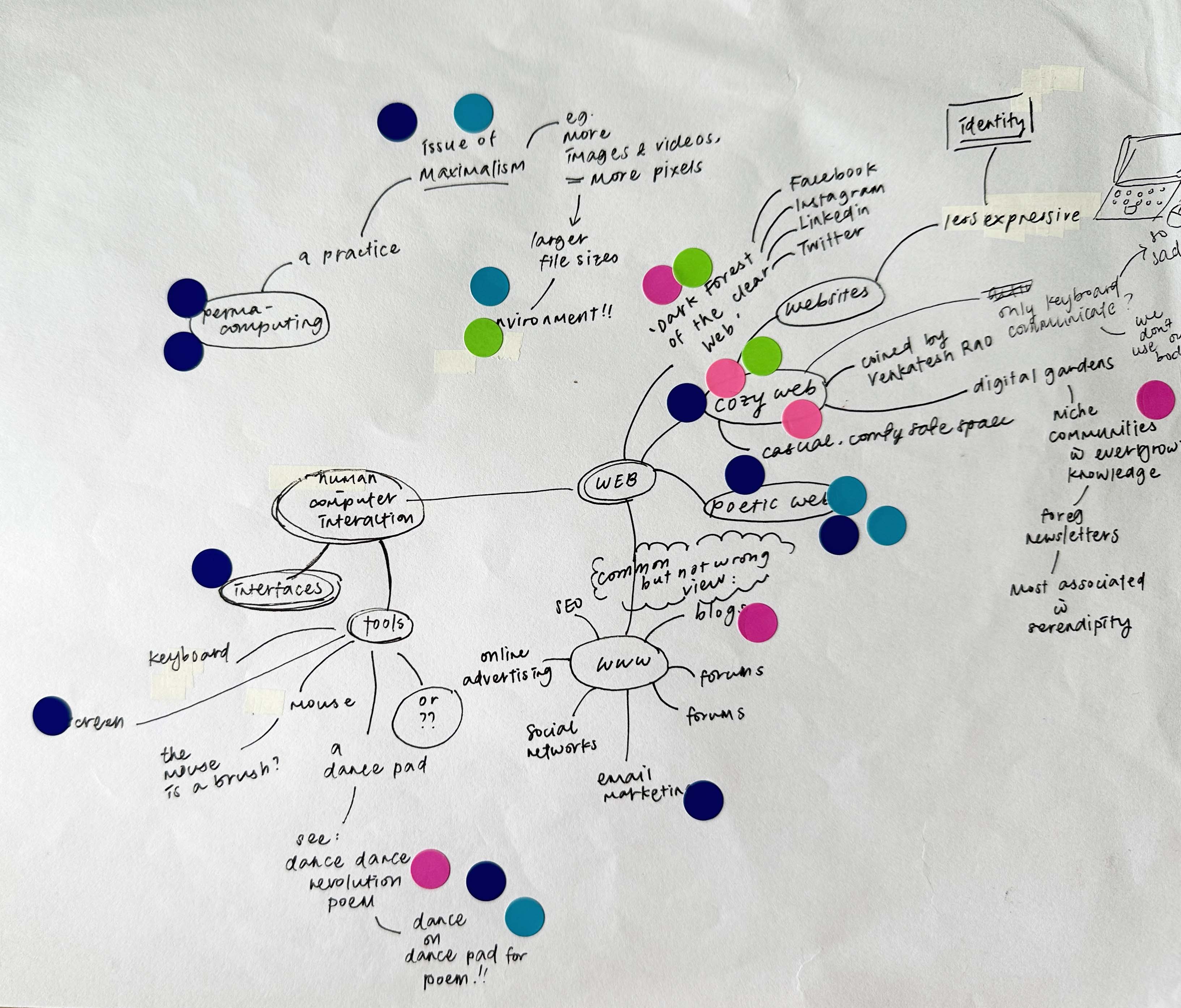 From the responses gathered from my classmates, I can see that the concepts of cozy web, poetic web, followed by Dance Dance Revolution garnered the most interest. I wish I knew the reason why, but I would like to believe that it is a shared sentiment that the web feels like its lacking as it is now a more commercialised place. Users are looking for better web spaces to be at, and that's why they are drawn to words like poetic and cozy web. What does poetic and cozy web feels like? and what isit like? I think this exercise further reaffirmed my research inquiry into the web, and that I should continue on with what I have.