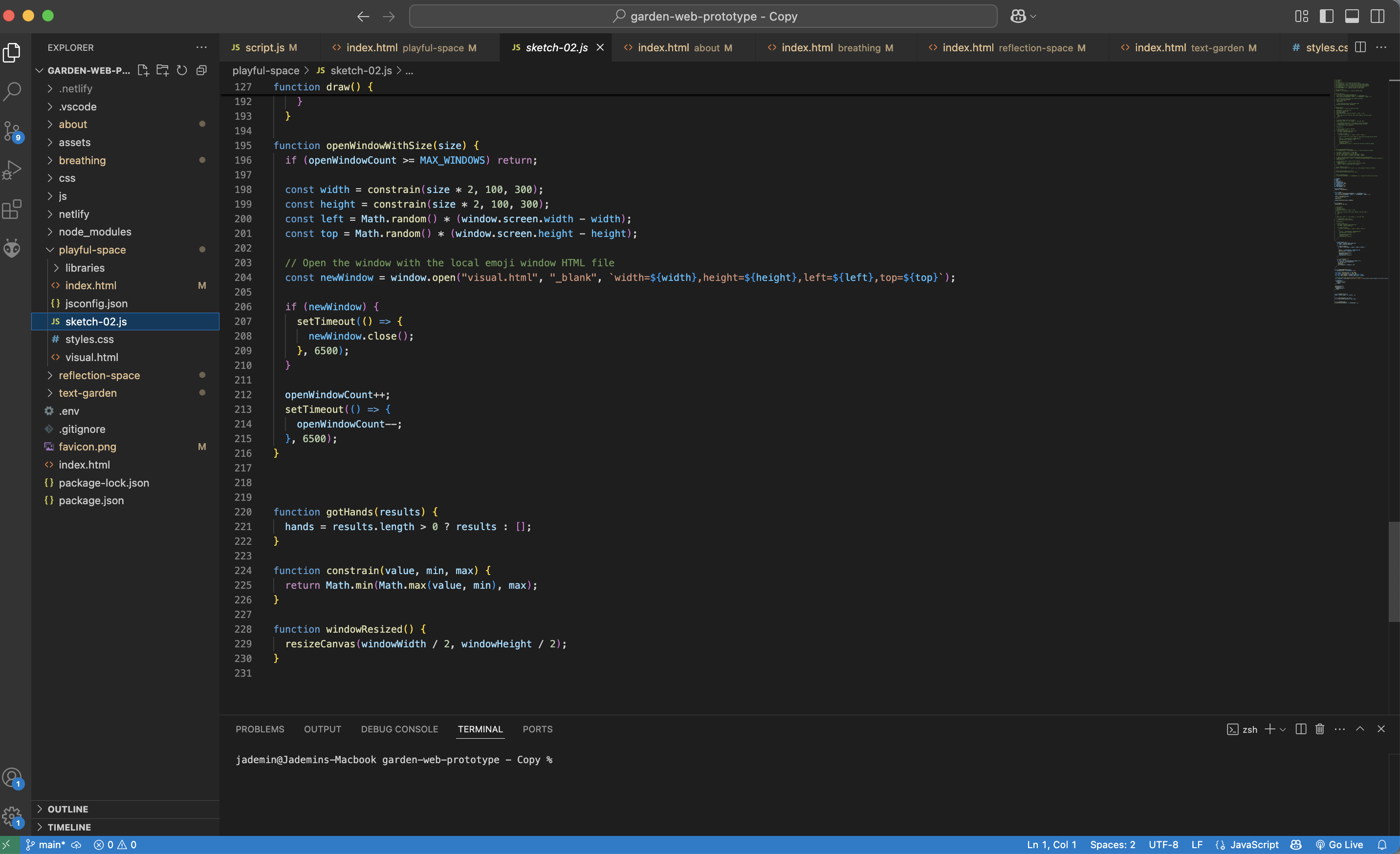 So far, Garden Web already has 3 rooms, Breathing Space, Reflection Space, and Community Garden. And based on Shu Min's feedback and open studios, I would add the final room, which is the gestures to browser room. I started with incorporating the sem one interaction into the website, and tweak things slowly one by the one. The first step was to make the browsers close on its own. Much of this was done through the help of Chatgpt.