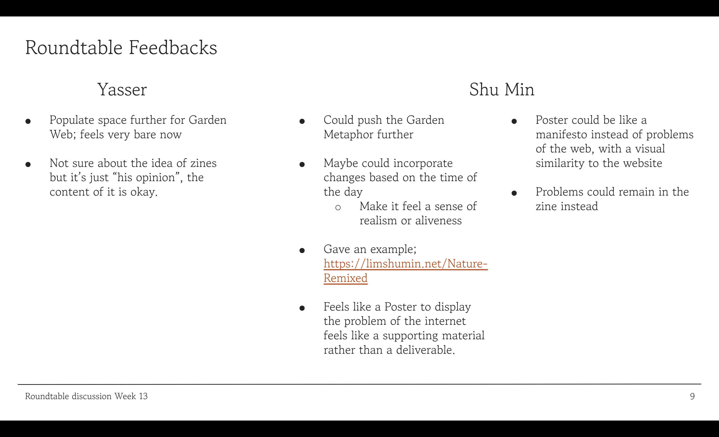 I think I really agreed with Shu Min's comments and feedbacks on how Garden Web feels very static and nothing much gg on, I think the I did have ideas to implement some kind of liveliness to the website, but I'd also have to think of whether i'll be able to execute given the short amount of time and technicals too. Reflecting back on the feedback during open studios and also Shu Min, I think I'd find a creative ways for users to interact with browser art. The zine alone already talks about the problems, and the introduction of a poetic web and the idea behind it, so I think I would leave it as it is, and revised the deliverables again.