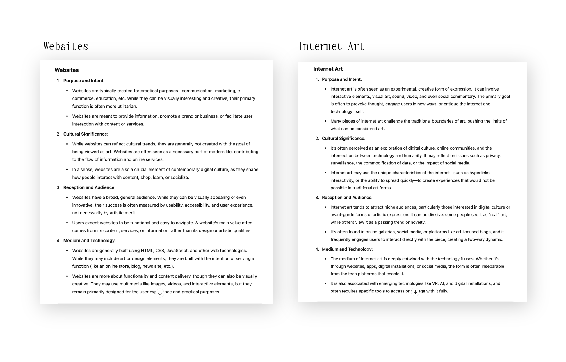 Reading up more about the community that I'm currently getting all my sources from, I find that I might struggle to communicate this project to a general/design audience. When I use the term web, or poetic web, I hope it sticks and is more palatable to the audience who doesn't know what my project is about. To establish the difference where my project stands, I chatgpt-ed the general perception of websites vs internet art. In general, I would assume that Internet Art is more cultural, creative, and experimental, rather than the perception of Websites, which are generally viewed as functional, everyday tools for accessing and disseminating information. I would stick to using the word Websites or Poetic Web more to describe as I think it's more palatable for designers or to a general audience.